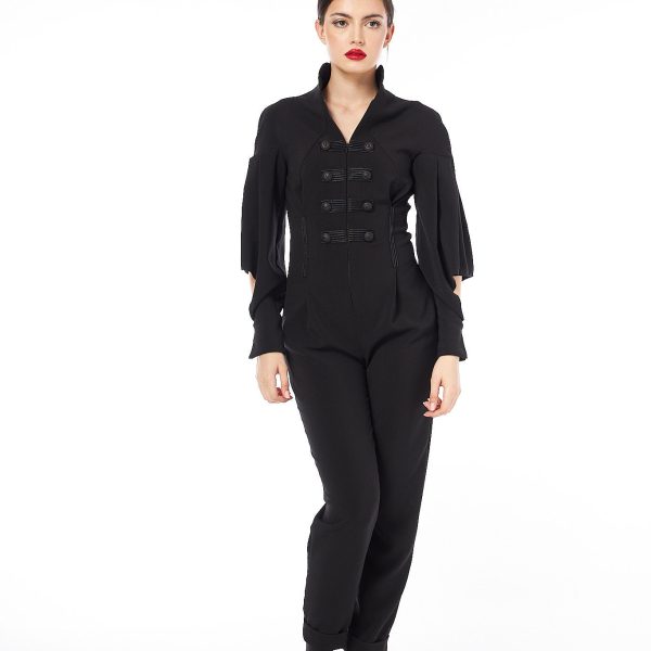 Pantalonii sunt realizati dintr-un material fluid, au talia inalta remarcandu-se pliurile laterale care dau ritmicitate si devin centrul de interes .Sunt conici dar usor lejeri pentru confort.Sunt prevazuti cu buzunare