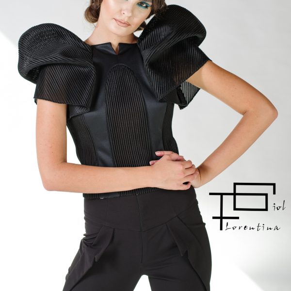 Bluza Eana cu maneci structurate. Forma, liniile decorative ne trimit către arhitectura lui Gaudi.Talia este evidențiată prin cordonul detasabil.
