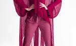 Manecile sunt supradimensionate prin pliuri si volum in zona umerilor. Din decolteul gatului coboara simetric doua volane care evidentiaza prin pozitia lor manecile dar si zona bustului.