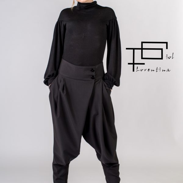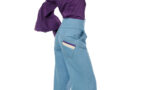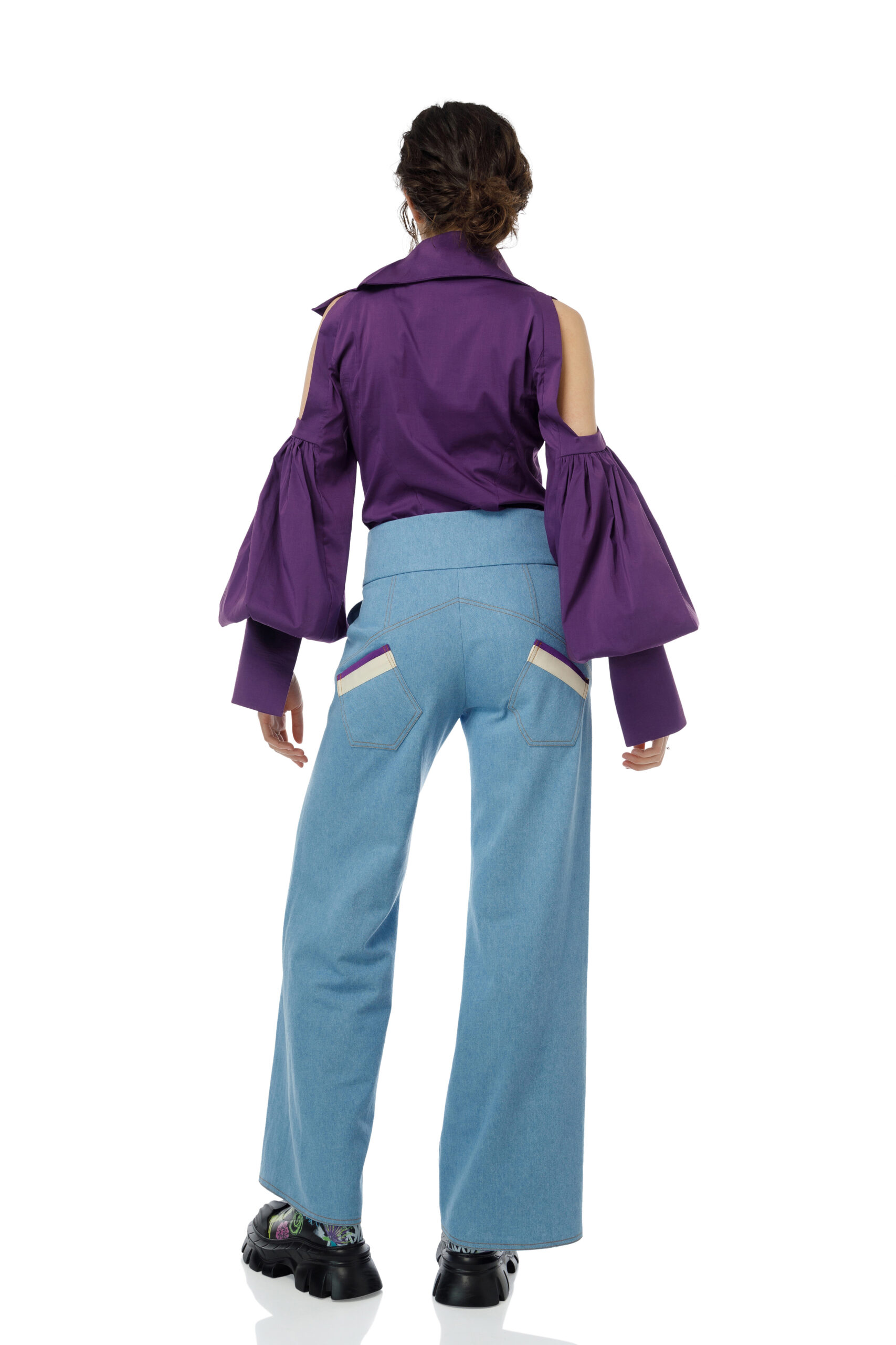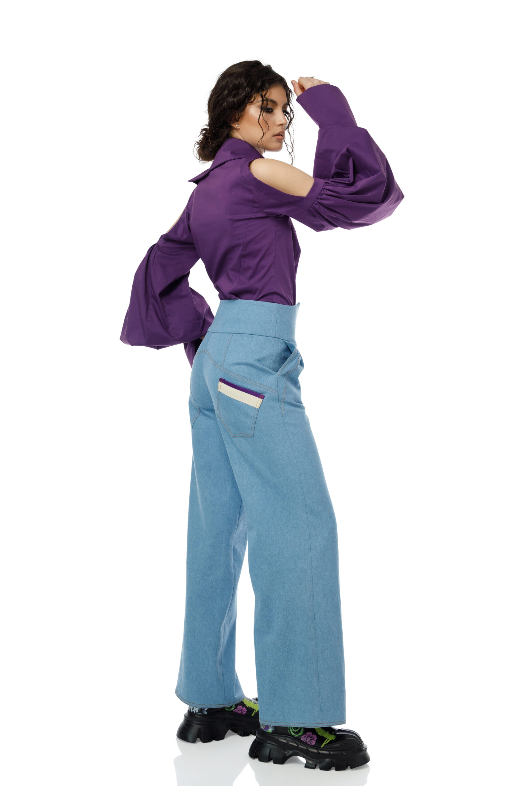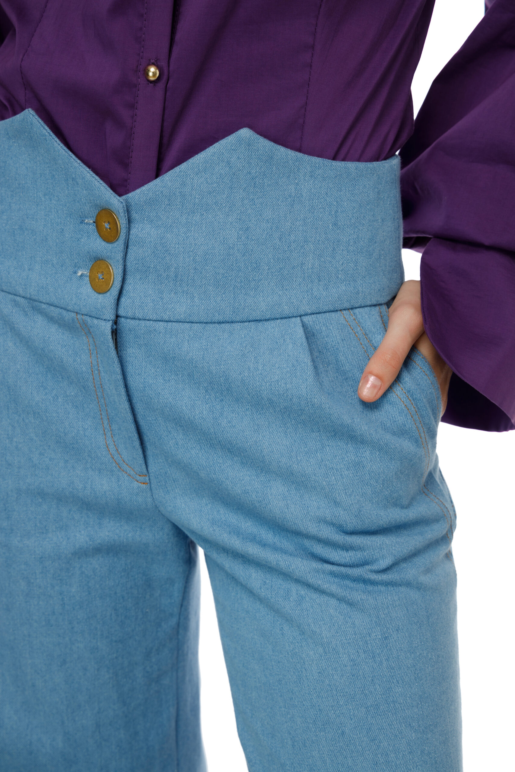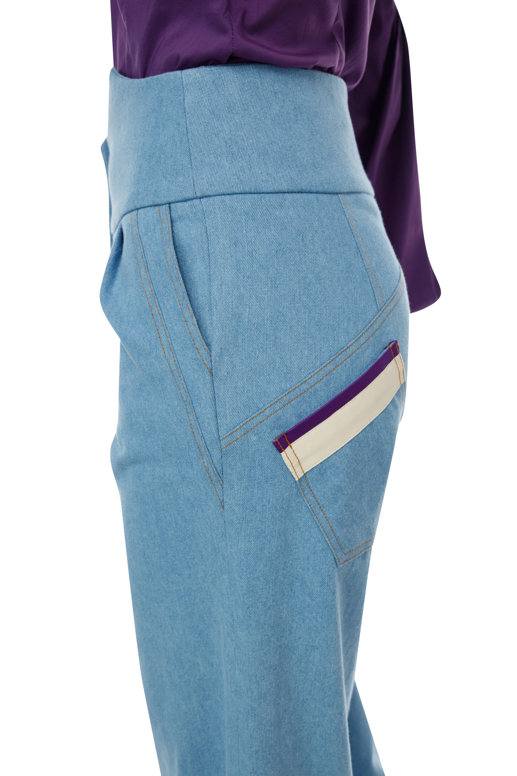 Pantalonii sunt evazati , au buzunare laterale dar si pe spate , acestea  avand  aplicate benzi contrast . Cusaturile decorative evidentiaza croiul .