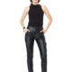 Pantalonii au cusaturi decorative care pornesc din zona buzunarelor si coboara pe centrul fetei pana la genunchi. Pantalonii sunt realizați din piele ecologica elastica. Partea interioara a materialului este căptușita .