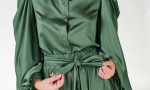 Manecile sunt supradimensionate prin pliuri si volum in zona umerilor. Din decolteul gatului coboara simetric doua volane care evidentiaza prin pozitia lor manecile dar si zona bustului.
