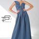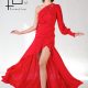 Rochie lunga cu spatele gol sustinuta de bretele fine. Zona taliei este marcata de cordon. Din zona decolteului coboara asimetric un volan pe lateralul rochiei.
