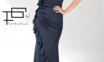 Rochie lunga cu spatele gol sustinuta de bretele fine. Zona taliei este marcata de cordon. Din zona decolteului coboara asimetric un volan pe lateralul rochiei.