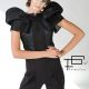 Manecile sunt supradimensionate prin pliuri si volum in zona umerilor. Din decolteul gatului coboara simetric doua volane care evidentiaza prin pozitia lor manecile dar si zona bustului.
