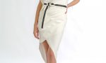 Partea de jos a rochiei, asimetrica si ea, este parte peste parte, in spate atinge zona gambei iar in fata se scurtează pana deasupra genunchiului.