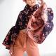 Manecile sunt supradimensionate prin pliuri si volum in zona umerilor. Din decolteul gatului coboara simetric doua volane care evidentiaza prin pozitia lor manecile dar si zona bustului.