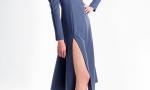 Pe lateralul fetei se deschide un slit subtil pe un picior. Se inchide pe spate cu fermoar ascuns.