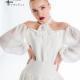 Manecile sunt supradimensionate prin pliuri si volum in zona umerilor. Din decolteul gatului coboara simetric doua volane care evidentiaza prin pozitia lor manecile dar si zona bustului.